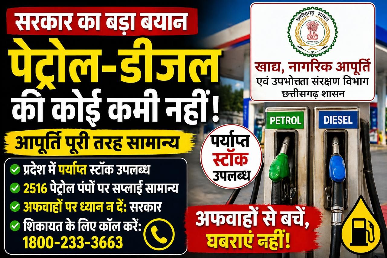 रायपुर। खाद्य, नागरिक आपूर्ति एवं उपभोक्ता संरक्षण विभाग ने साफ किया है कि प्रदेश में पेट्रोल और डीजल की पर्याप्त…