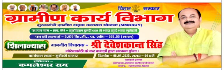 Spread the love 🙏नमस्ते 🙏 कल का सड़क का शिलान्यास कार्यक्रम l इस अवसर पर आप सादर आमंत्रित है l आप सभी को सादर सूचित करते हुए हर्ष हो रहा है कि लकड़ी नबीगंज प्रखंड में विकास की कड़ी को जोड़ते हुए क्षेत्र की सम्मानित जनता के बीच गोरेयाकोठी विधानसभा क्षेत्र के लोकप्रिय माननीय विधायक श्री … Continue reading कल का सड़क का शिलान्यास कार्यक्रम