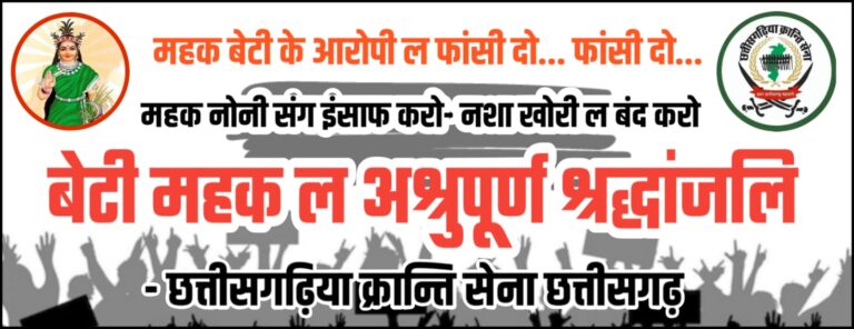 Spread the love दुर्ग में 6 साल नोनी के संग होए अमानवीय घटना के विरोध में छत्तीसगढ़ीया क्रान्ति सेना जोहार छत्तीसगढ़ पार्टी छत्तीसगढ़ीया युवा क्रान्ति सेना धरसींवा खण्ड में दिया जला के श्रद्धांजली दे हन धरसींवा, रायपुर। दुर्ग जिले में 6 साल की मासूम बच्ची के साथ हुई अमानवीय घटना ने पूरे प्रदेश को झकझोर कर … Continue reading दुर्ग में 6 साल नोनी के संग होए अमानवीय घटना के विरोध में छत्तीसगढ़ीया क्रान्ति सेना जोहार छत्तीसगढ़ पार्टी
