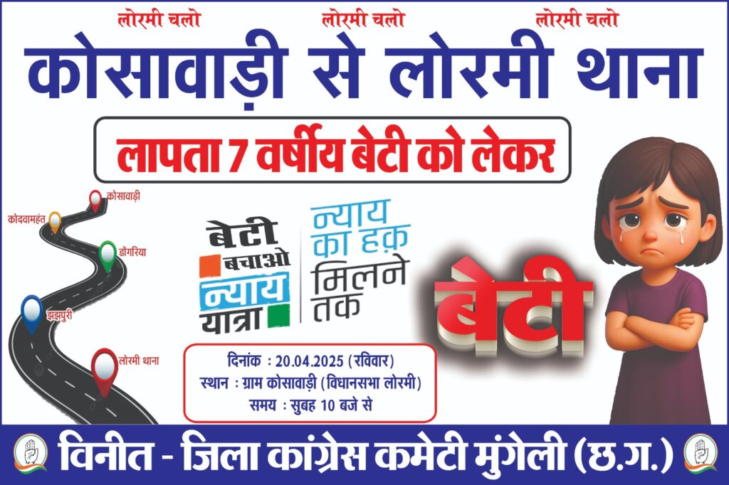 बेटी के लिए न्याय की राह पर कदम: मुंगेली जिला कांग्रेस 20 अप्रैल को निकालेगी पदयात्रा