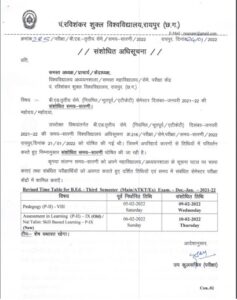 विगत दिनों विश्वविद्यालय की ओर से बीएड तृतीय सेम की परीक्षा का टाइम टेबल (BEd 3rd Sem Exam Time Table) जारी किया गया था, जिसके बाद विश्वविद्यालय ने सोमवार को परीक्षा को लेकर नया टाइम टेबल जारी किया जिसके अनुसार एग्जाम 5 फ़रवरी की जगह अब 9 फरवरी को करने जा रहा है। यह आदेश विश्वविद्यालय के कुलसचिव डॉ. गिरीशकांत पांडेय की ओर से जारी किया गया है।