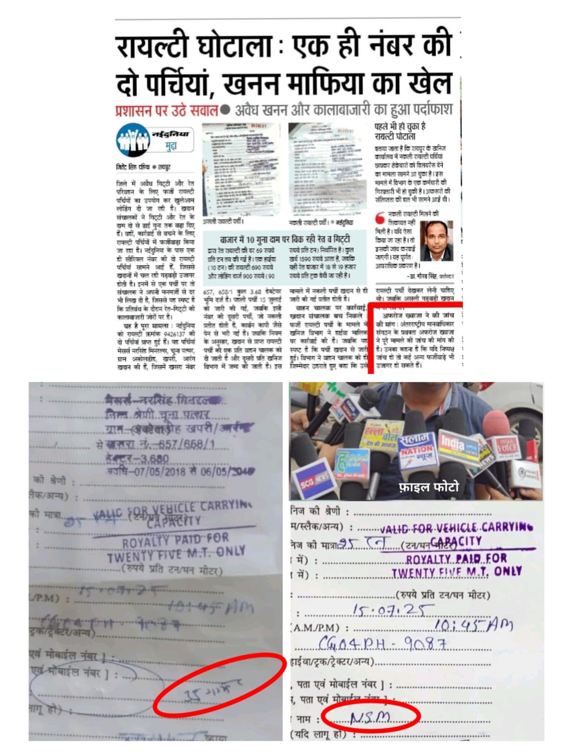 गाड़ी पर केस बना थाने मे खड़ी कर दी गई उक्त गिट्टी रायल्टी क्रमांक 9426137 की दो पर्चियां जिसमे अंतर आसानी से दिखता है यह पर्चियां मेसर्स नरसिंह मिनरल्स, चूना पत्थर, ग्राम अकोलडीह, खपरी, आरंग खदान की हैं, जिसमें खसरा नंबर 657, 658/1 कुल 3.63 हेक्टेयर भूमि दर्ज है। पहली पचीं 15 जुलाई को जारी की गई, जबकि इसी नंबर की दूसरी पचीं, जो नकली प्रतीत होती है, कार्बन कापी जैसे पेन से भरी गई है। जबकि नियम के अनुसार, खदान से प्राप्त रायल्टी पचीं की एक प्रति वाहन चालक को दी जाती है और दूसरी प्रति खनिज विभाग में जमा की जाती है। इस